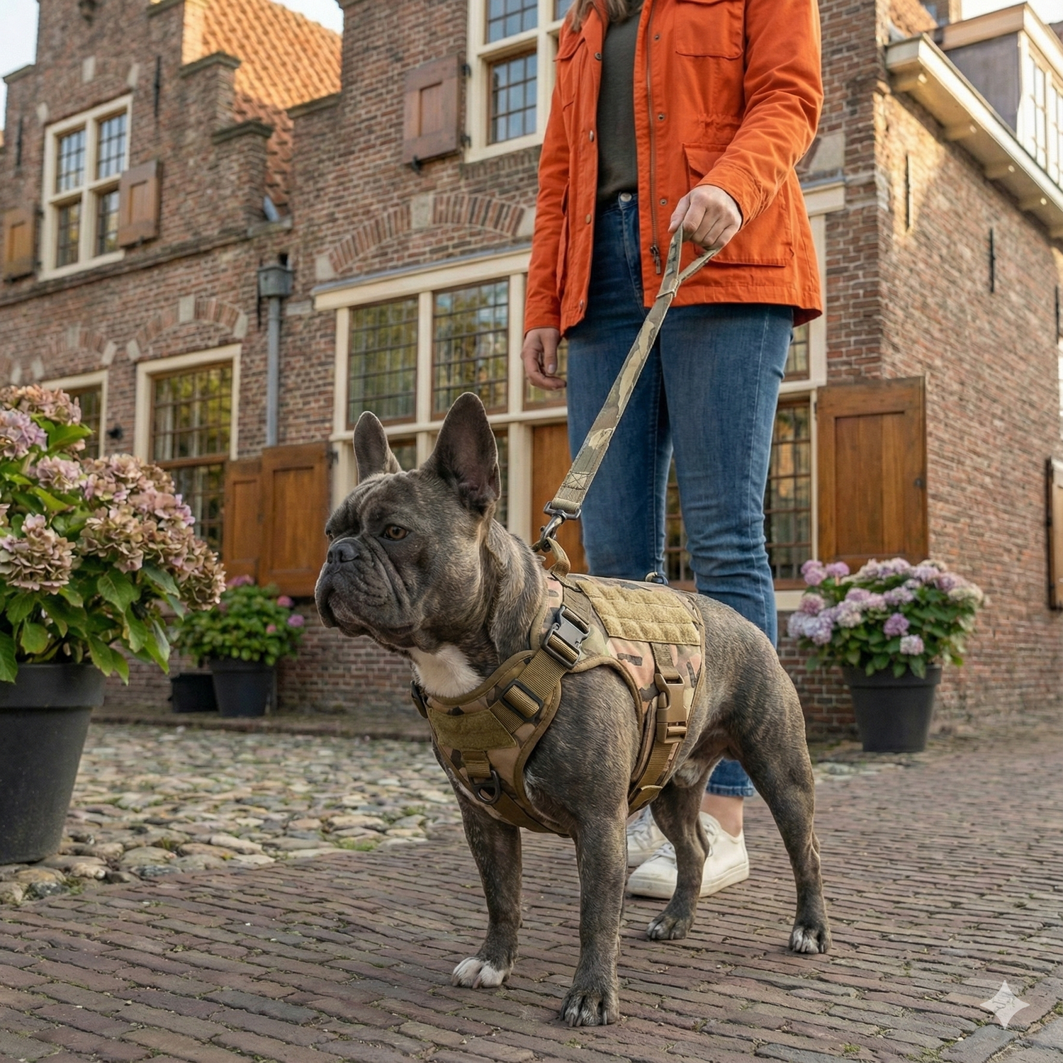 Het harnas is ontworpen om snel en makkelijk te gebruiken. Je hond stapt met de voorpoten in, jij legt het over de rug en klikt de gespen vast. Binnen een paar seconden zit het stevig en comfortabel, zonder gedoe.