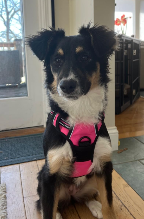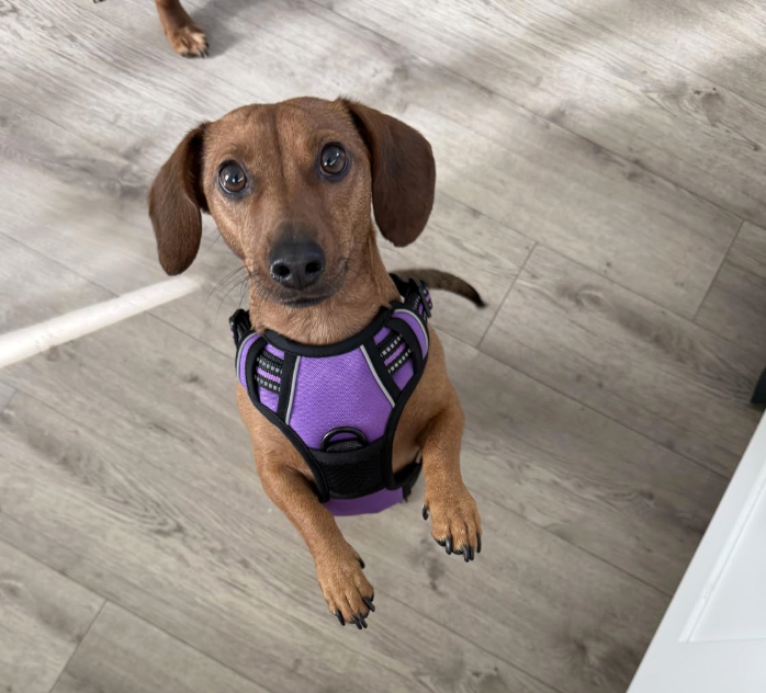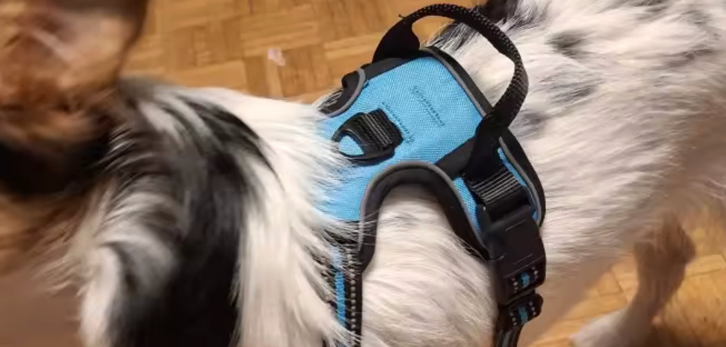 Een halti vond hij echt verschrikkelijk maar dit tuig doet hij graag om. En het verschuift niet en drukt niet onder de oksels.